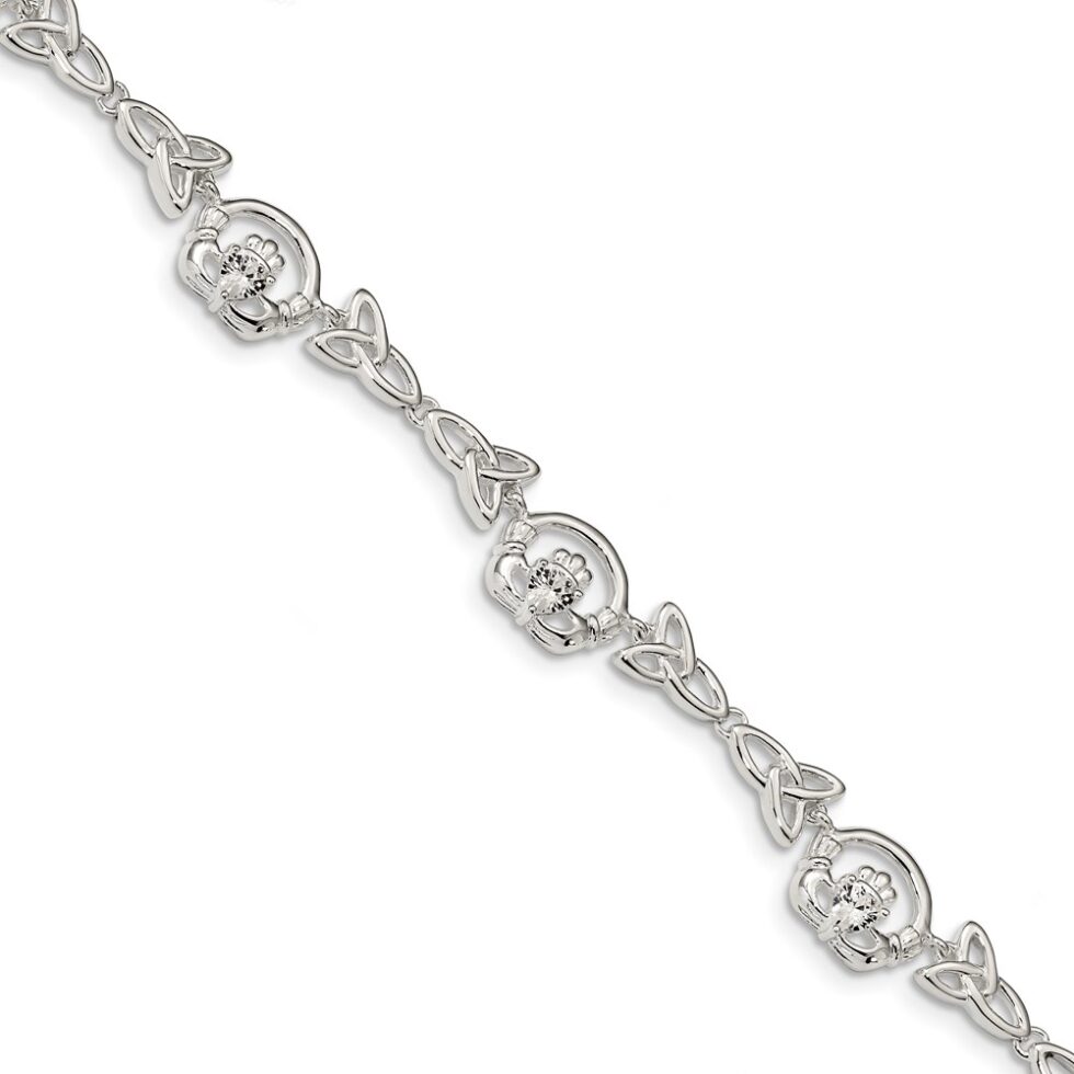 Sterling Silver Polished CZ Clauddagh/Trinity Symbol Link Bracelet