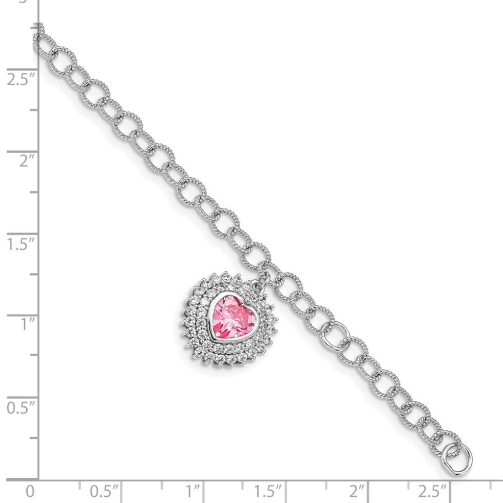 Sterling Silver Rhodium-plated Pink CZ Heart Dangle Bracelet