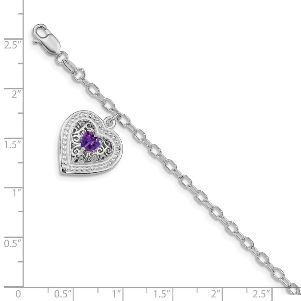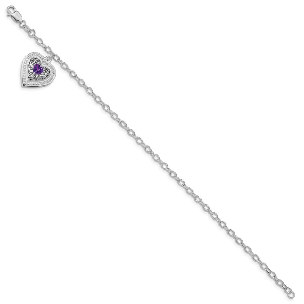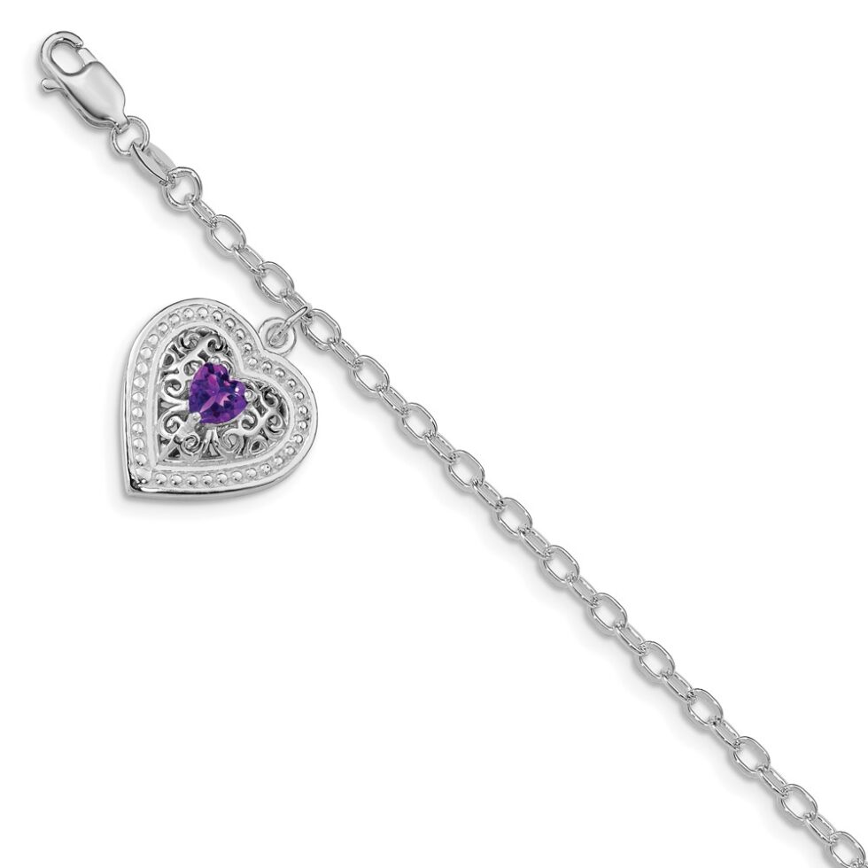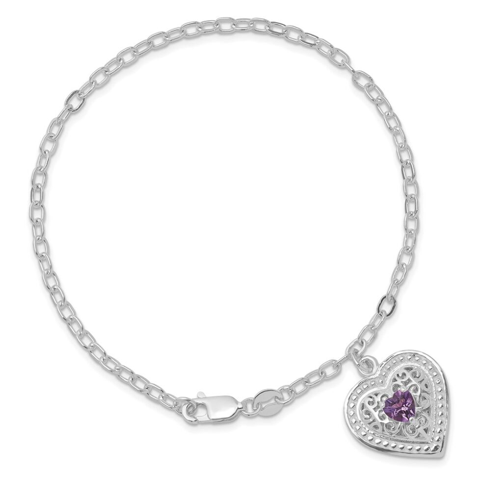 Sterling Silver Rhodium-plated Purple CZ Heart Texture/Polish Link Bracelet