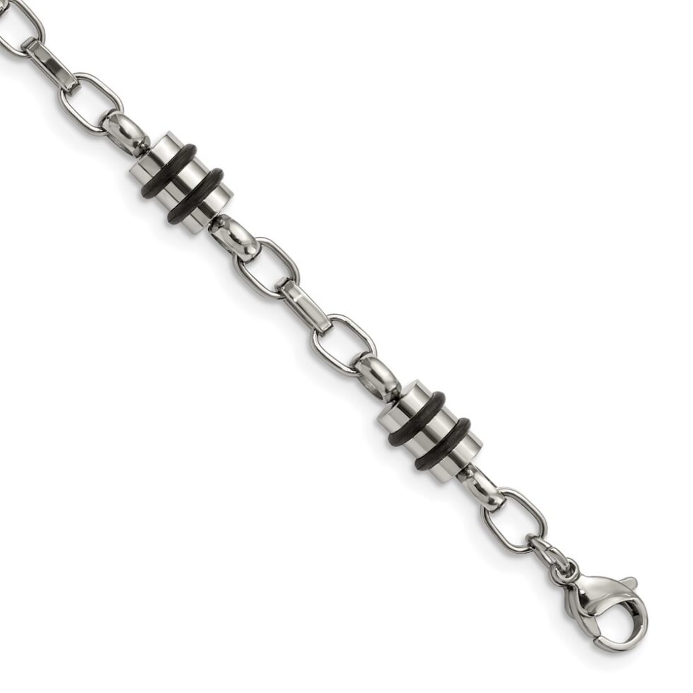 Stainless Steel Polished w/Black Rubber Barrel Link 8in Bracelet