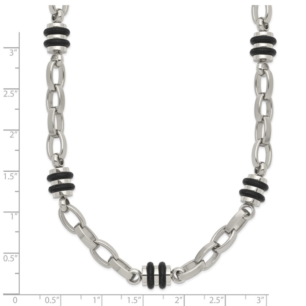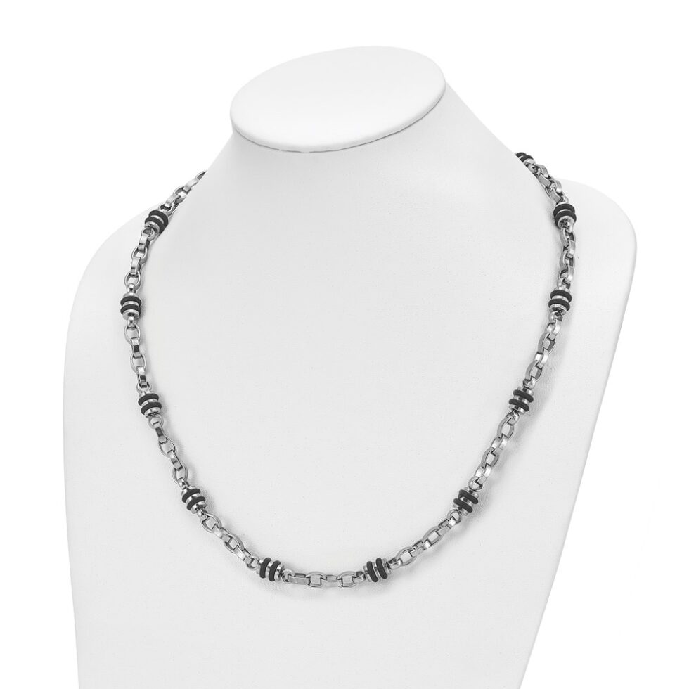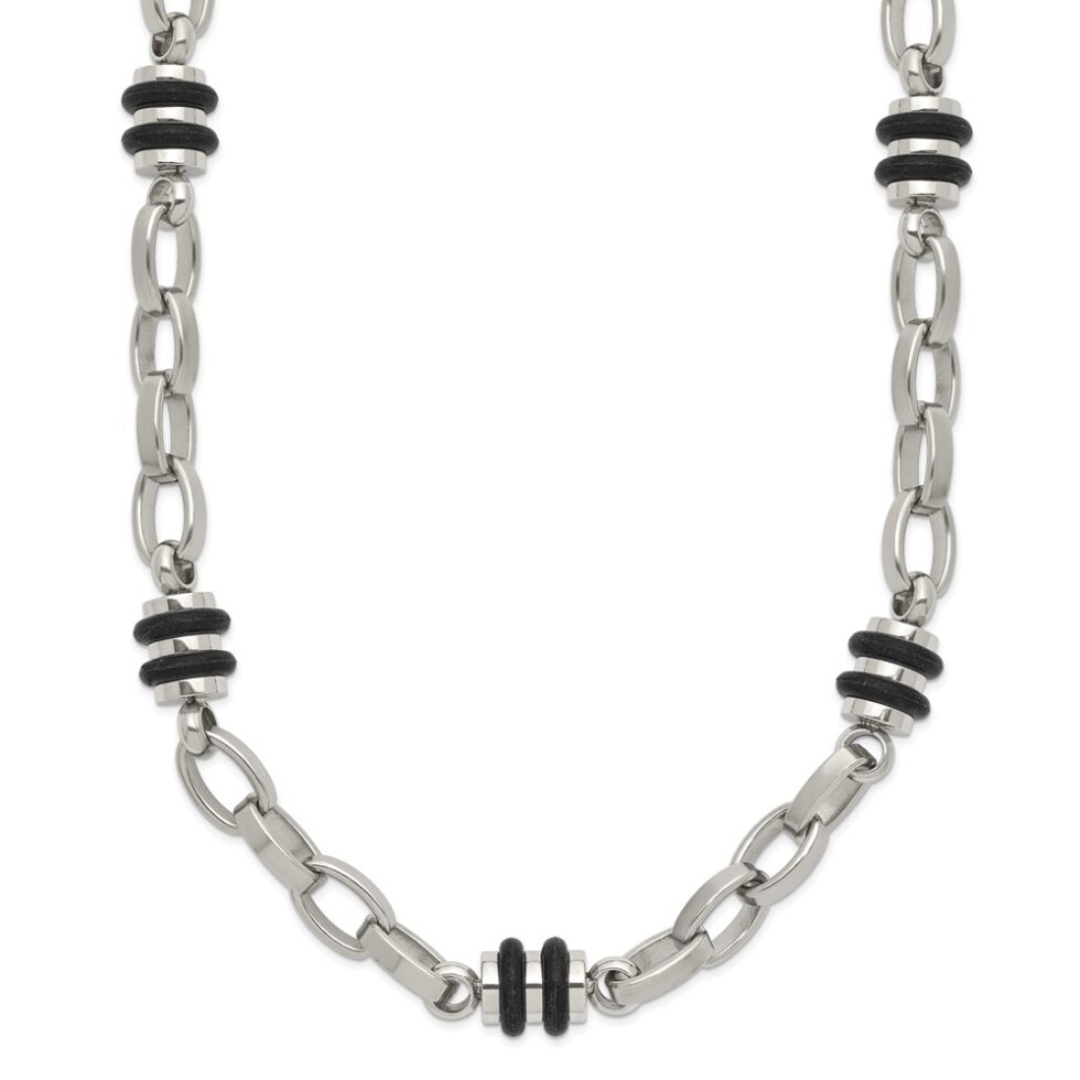 Stainless Steel Polished w/Black Rubber Barrel Link 22in Necklace
